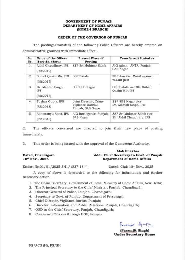 Chandigarh, November 18, 2025- The Punjab government has transferred five IPS officers including three SSPs with immediate effect.