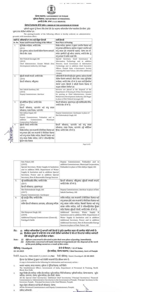 Chandigarh, October 22, 2025: The Punjab Government has ordered the transfers and postings of 6 IAS officers with immediate effect.
